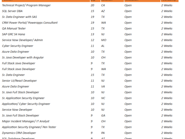 Hi Professionals Greetings for the day. Hope you are doing well! This is Durga from Seertek Systems, we do have a number of consultants looking up for new projects around …