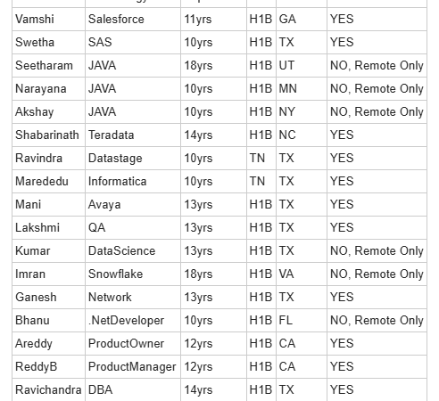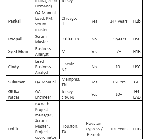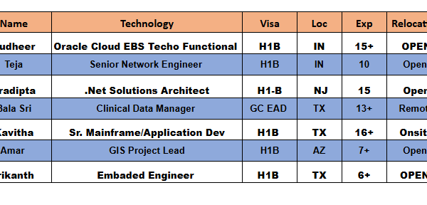 Hi Recruiters,I am Aishwarya, Bench Sales Recruiter from Global IT LLC,(Not For Bench Sales Recruiter)Below are my Consultants who are available for immediate projectsPlease share …