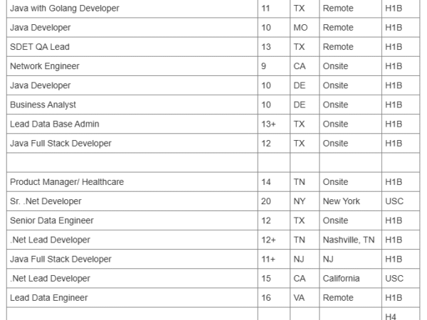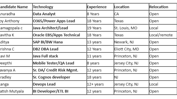 Hello, Hope you're doing great, We currently have a strong bench of experienced consultants available immediately for new project opportunities. Open for C2C, remote, onsite, …