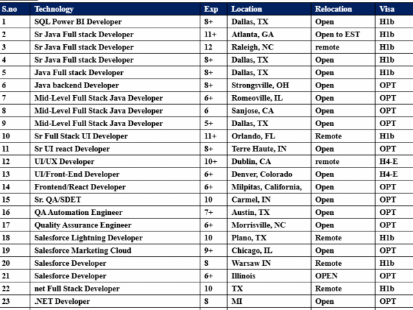 John KaryJune 5, 2025June 5, 2025Do you have any requirements on C2C “JAVA DEVELOPER” “DATA ENGINEER” “QA” “DOT NET DEVELOPER” TYPE OF C2C REQUIREMETNS? Hi Hope you're doing well I’ve an excellent C2C profiles have a look and send the requirements to aliyah@agileadroit.com & 469-639-0933 Ext: 412 …