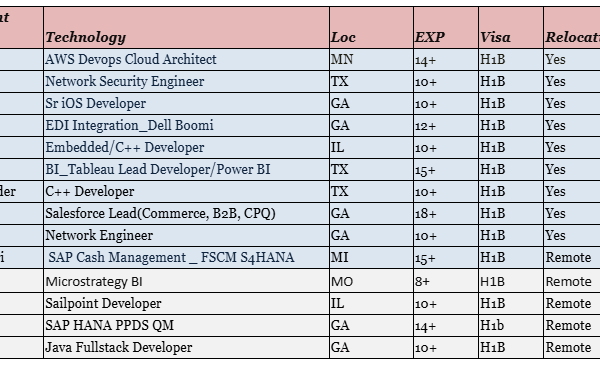 Hi, I hope you’re having a wonderful day!!!! Please share STRONG resumes with below mentioned mandatory skillset only Send the resume along with the skill …
